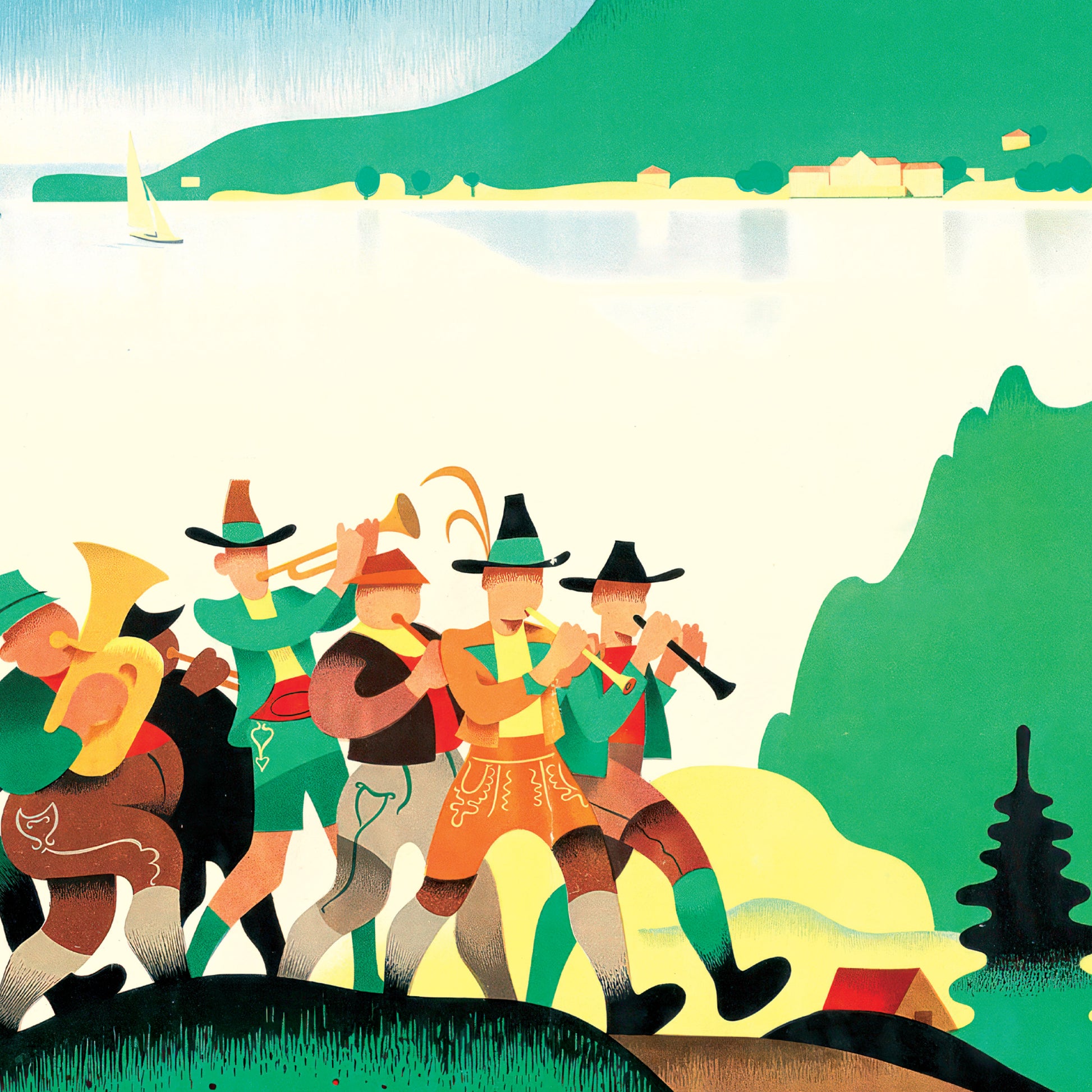 This fun mid-century tourism poster was created in the 1950s for the Austrian government's tourism board (the Italian phrase at the bottom, idillio di vacanze, translates as holiday idyll). It features a band of sturdy-looking musicians in traditional costume strolling by a lake on a walk through the mountains, impressing the local villagers as they go.