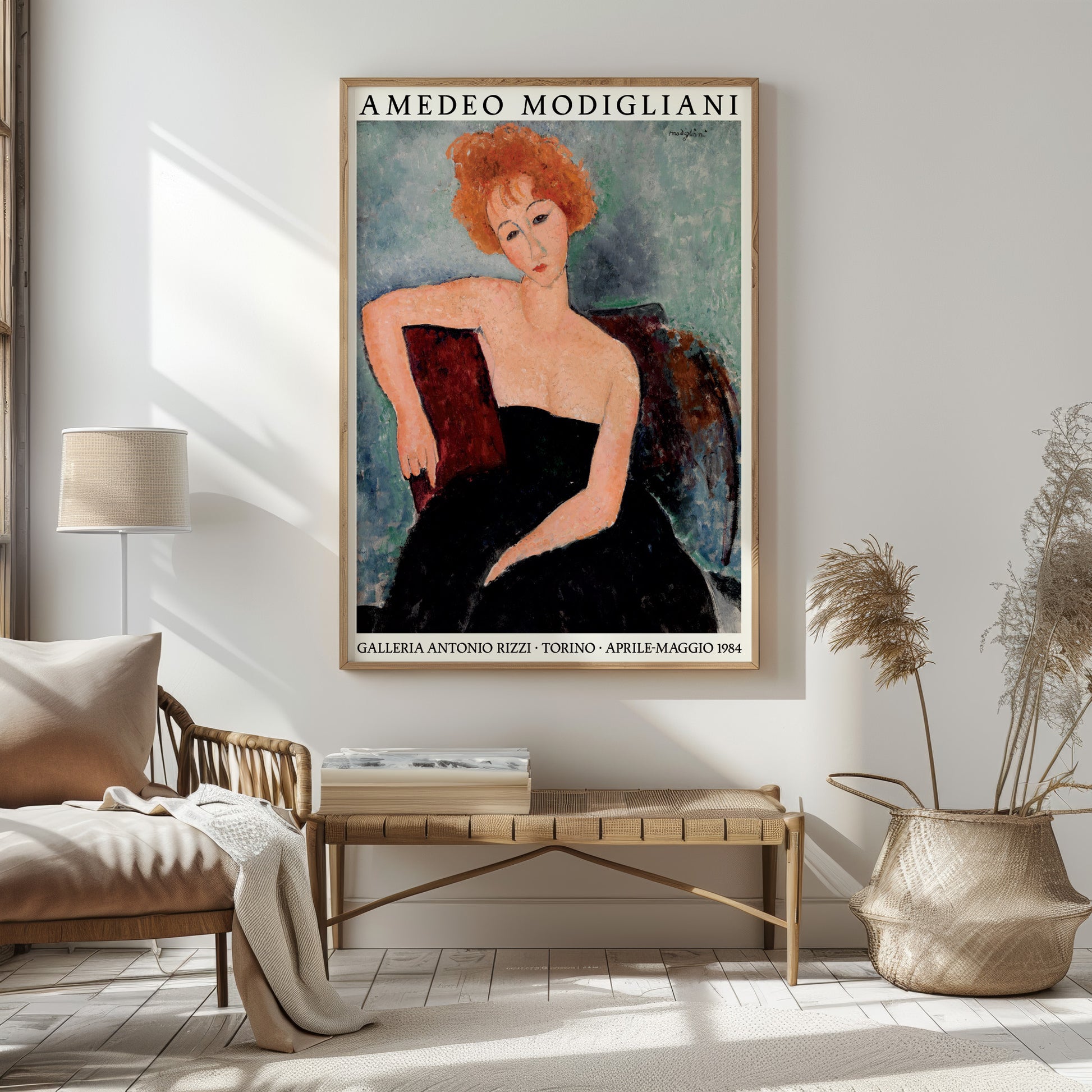 This Amedeo Modigliani print is an exhibition poster featuring his 1918 painting Portrait de la femme rousse (Portrait of the Red-Headed Woman). Modigliani's subject sits in her evening dress looking directly at us, her shoulder draped over the chair, looking determined and confident.