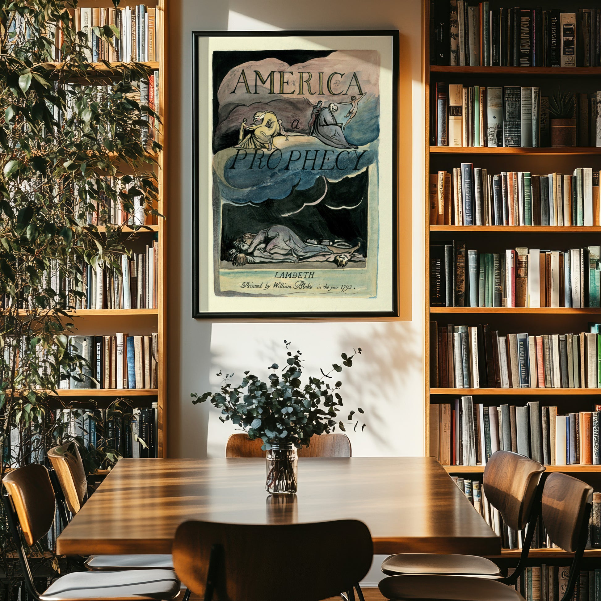 This poster features the title page illustration of 'America A Prophecy', a prophetic book by the English poet, artist and visionary William Blake. The book was published in 1793 and summed up Blake's thoughts on America and the American Revolution in poetic and mythological terms.