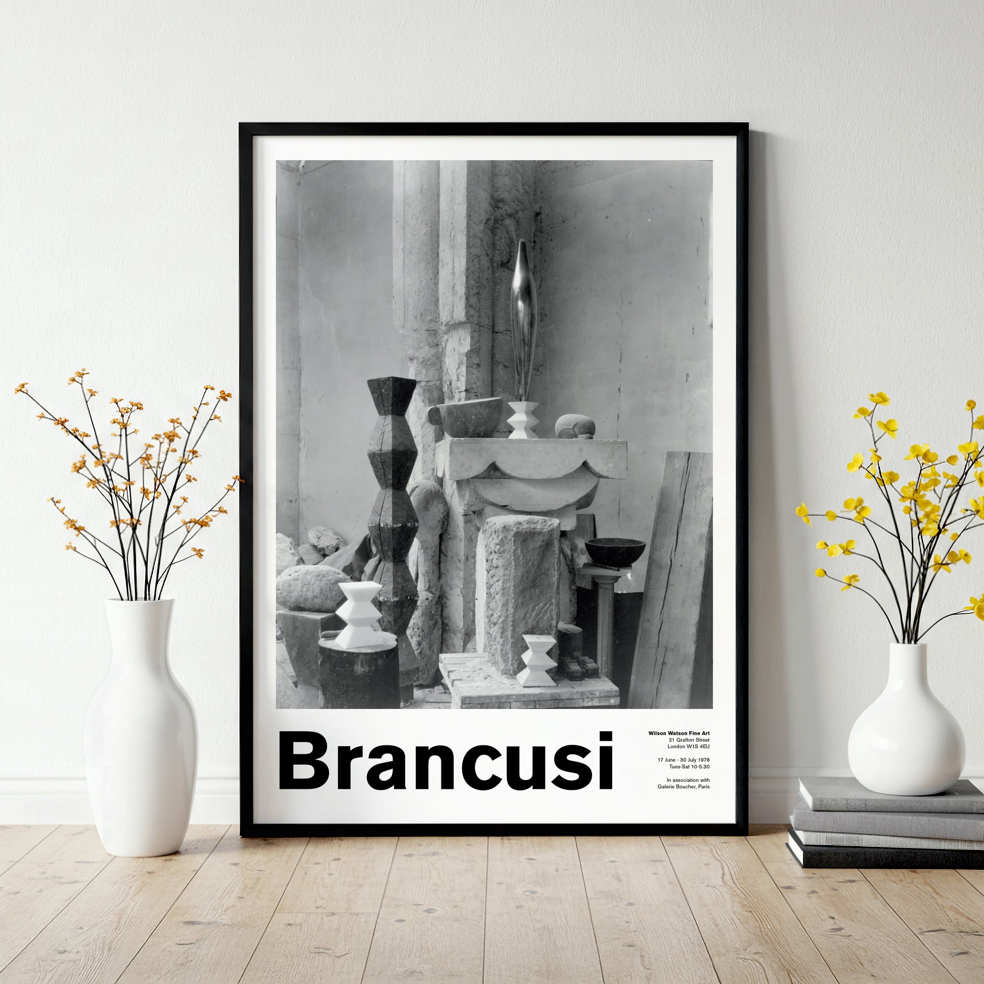 This vintage-style late 1970s art exhibition poster pays homage to Constantin Brancusi's work and features Edward Steichen's classic photograph of Brancusi's abstract sculpture studio. The minimalist Swiss typography adds to the poster's monochrome appeal, making it an ideal addition for modern art enthusiasts. Choose from A3, A2, and A1 sizes, printed on high-quality, archival paper for longevity.