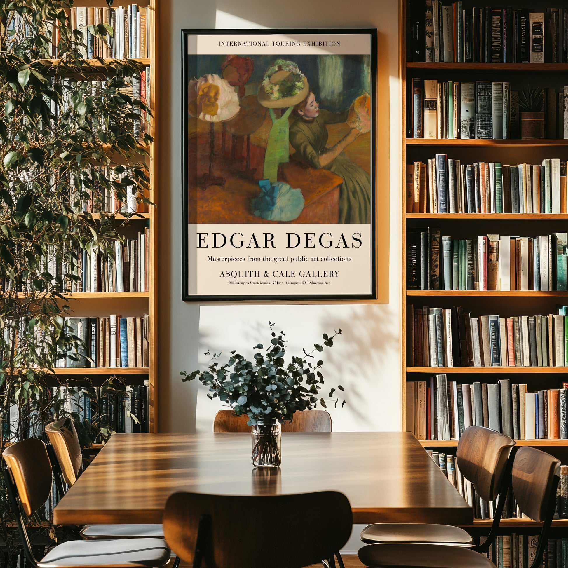 This 1950s exhibition poster shows Edgar Degas' beautiful painting The Millinery Shop, painted between 1879 and 1886.