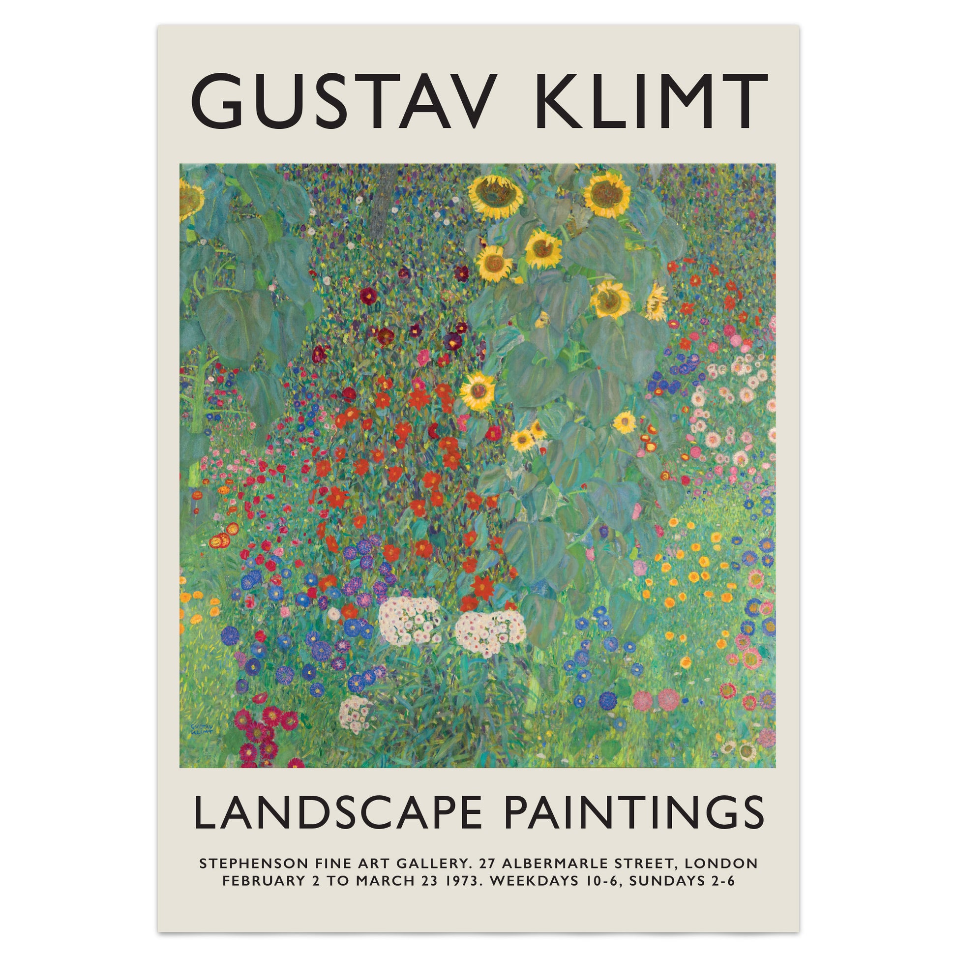 This exhibition poster shows Art Nouveau artist Gustav Klimt's beautiful 1908 painting Farm Garden With Sunflowers.