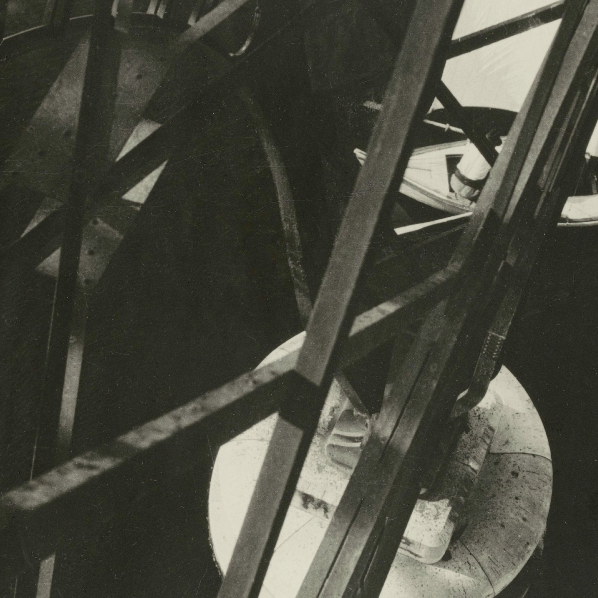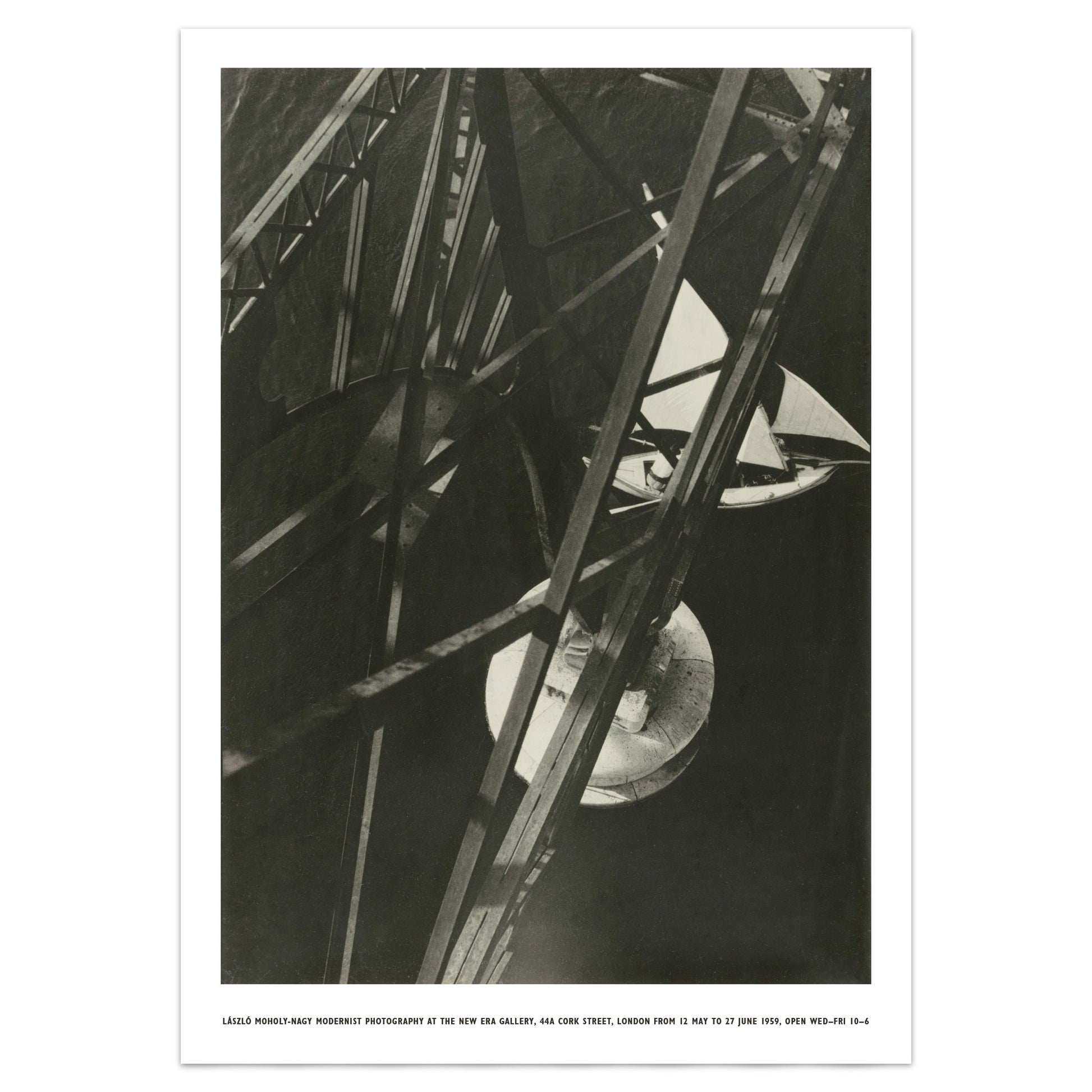 This poster print for an exhibition of the Hungarian artist László Moholy-Nagy's photographs features one of his stunning images taken from a steep perspective. View From The Pont Transbordeur, created in 1929, looks down from one of the two main towers of the transporter bridge that crossed the Rive Neuve in Marseille onto a sailing ship below, the bridge's steel superstructure dividing the composition up like a geometric abstract or Constructivist painting. Moholy-Nagy is perhaps best known as a central figure of the Bauhaus, where he was a professor from 1923-8.