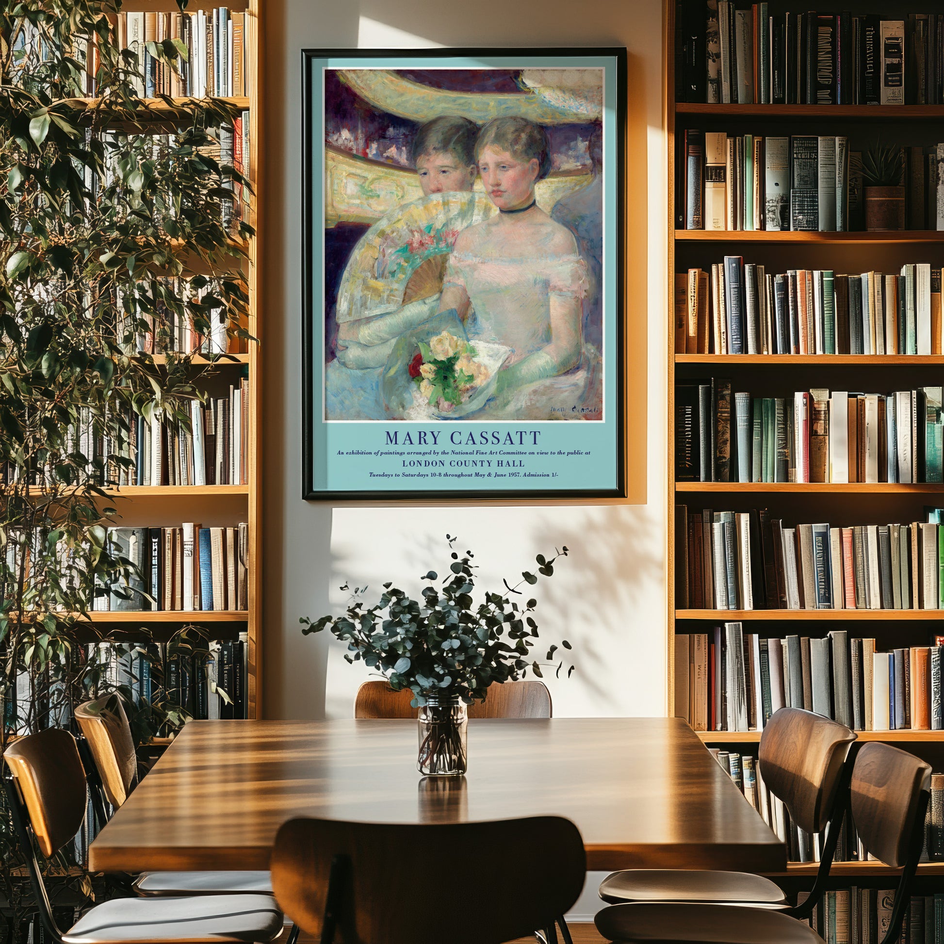 This exhibition poster print features the American Impressionist artist Mary Cassatt's famous painting The Loge, completed in 1880. It depicts two young women on a night out at the theatre, sitting in a loge (a private box) watching the show with a mixture of concentration and perhaps a touch of ennui. And we designed the poster to echo the kinds of exhibition posters one would have seen in London in the 1950s.