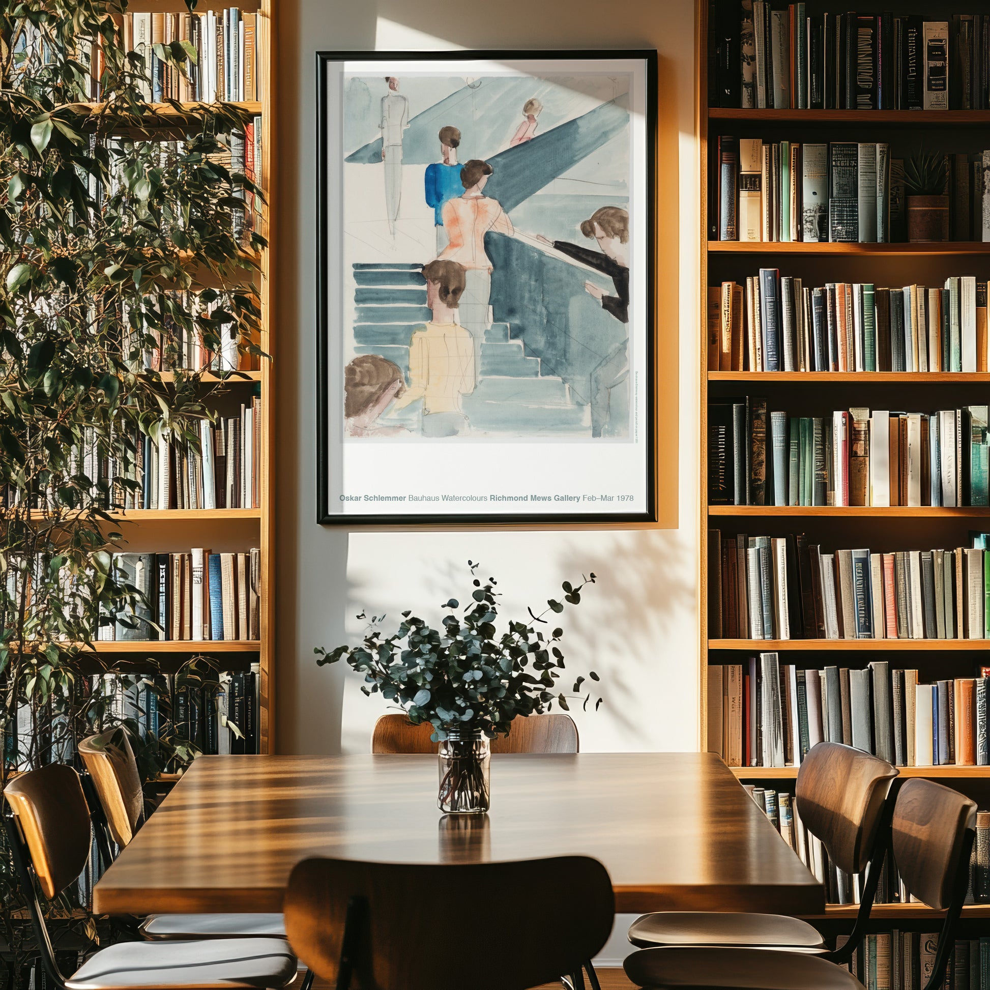 Schlemmer, a key figure in the Bauhaus movement, explored the relationship between human figures and their architectural surroundings. In ‘Bauhaus Stairway,’ he transforms an everyday scene into a statement on modernist aesthetics, emphasising symmetry, light, and spatial harmony. The original watercolour was completed during the final years of the Bauhaus era, reflecting both the movement’s utopian ideals and its shift toward a more industrial, streamlined aesthetic.