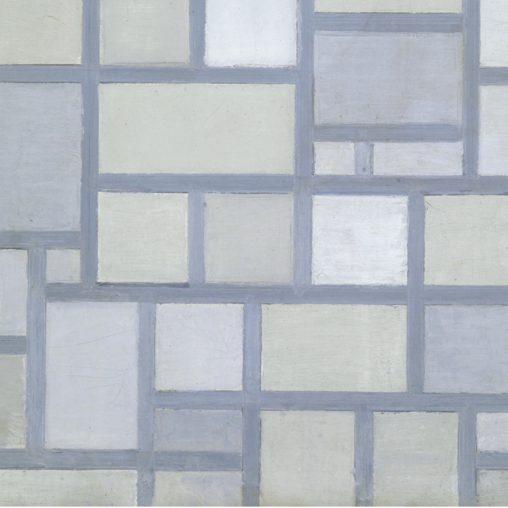The painting features a grid of muted grey lines and rectangles, representing a step towards his famous style of composition using black grids and primary colours. This piece reflects his journey towards creating "pure plastic art," aiming to capture universal beauty through balanced lines and forms.