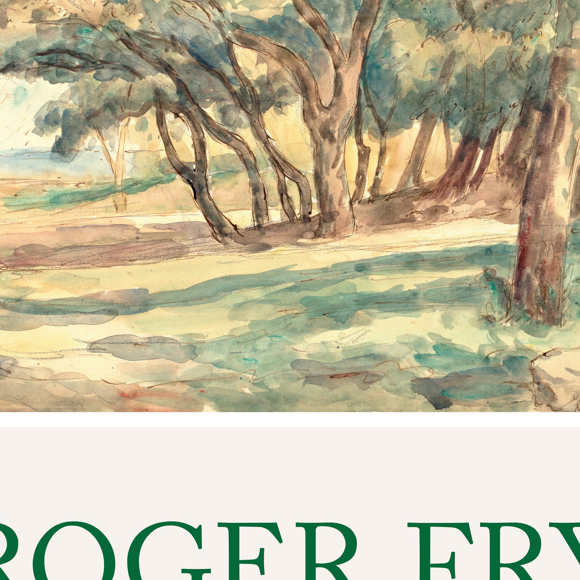 This exhibition poster for an imaginary show of watercolours features the 1922 painting 'A Wooded Glade Near St Tropez' by Roger Fry, the renowned artist and art critic. Fry is best known as the founder (in 1913) of the Omega Workshops, a design collective that merged artists and designers to produce decorative arts characterised by bold, abstract designs. Even so, in his sketches and watercolours Fry often aimed to capture what the eye sees rather than what the mind thinks, as beautifully illustrated in this poster.
