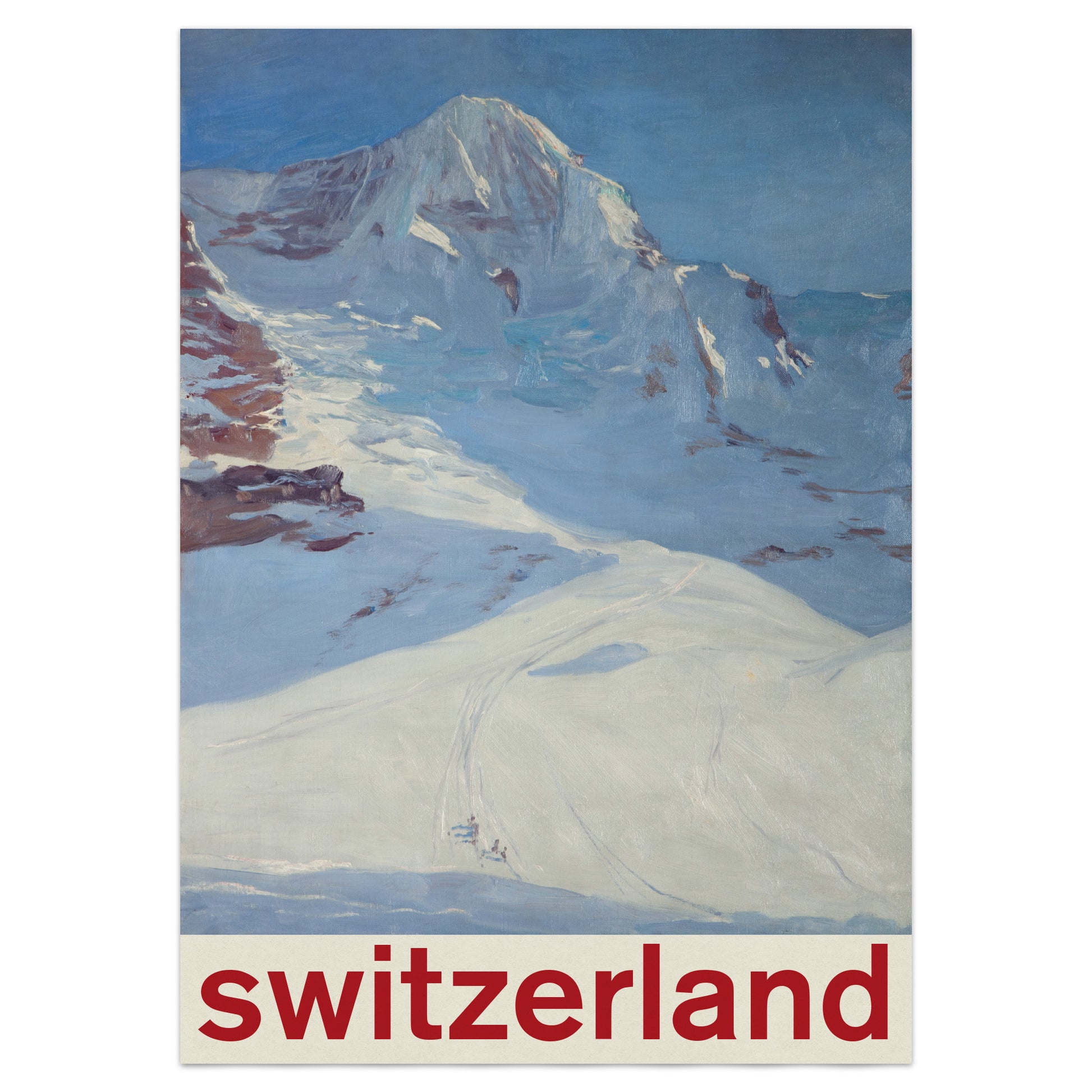 We designed this retro Swiss tourist poster in a vintage 1960s style - we love the really cool image-and-typography look that graphic designers in Switzerland used back then. Simple, elegant, refined design, using the classic Swiss typeface Akzidenz Grotesk (it looks cooler than it sounds), and a beautiful period painting of people skiing in the Swiss Alps, all together makes this a unique find for anyone who loves a little European sophistication on their walls.