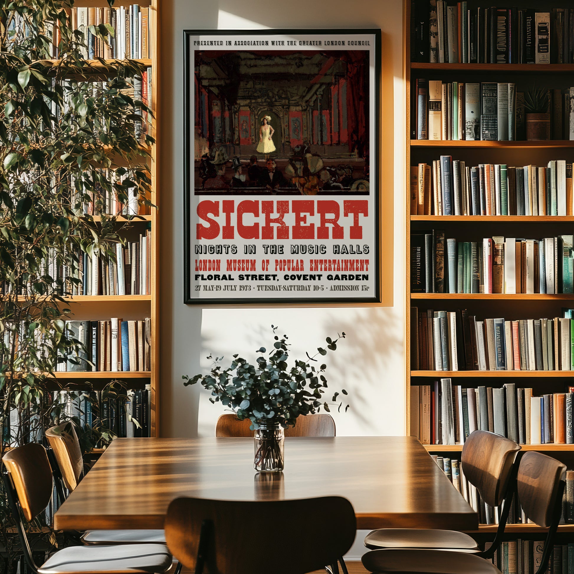 This exhibition poster features one of the German-British artist Walter Richard Sickert's paintings of music halls, in this case Gatti's Hungerford Palace of Varieties in 1888. On stage is the popular singer Katie Lawrence, whom Sickert drew over a hundred sketches of as well as a number of paintings over a twenty year period.