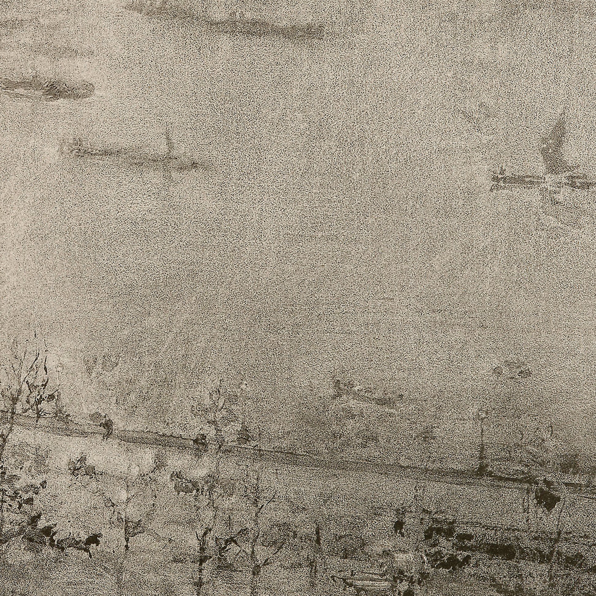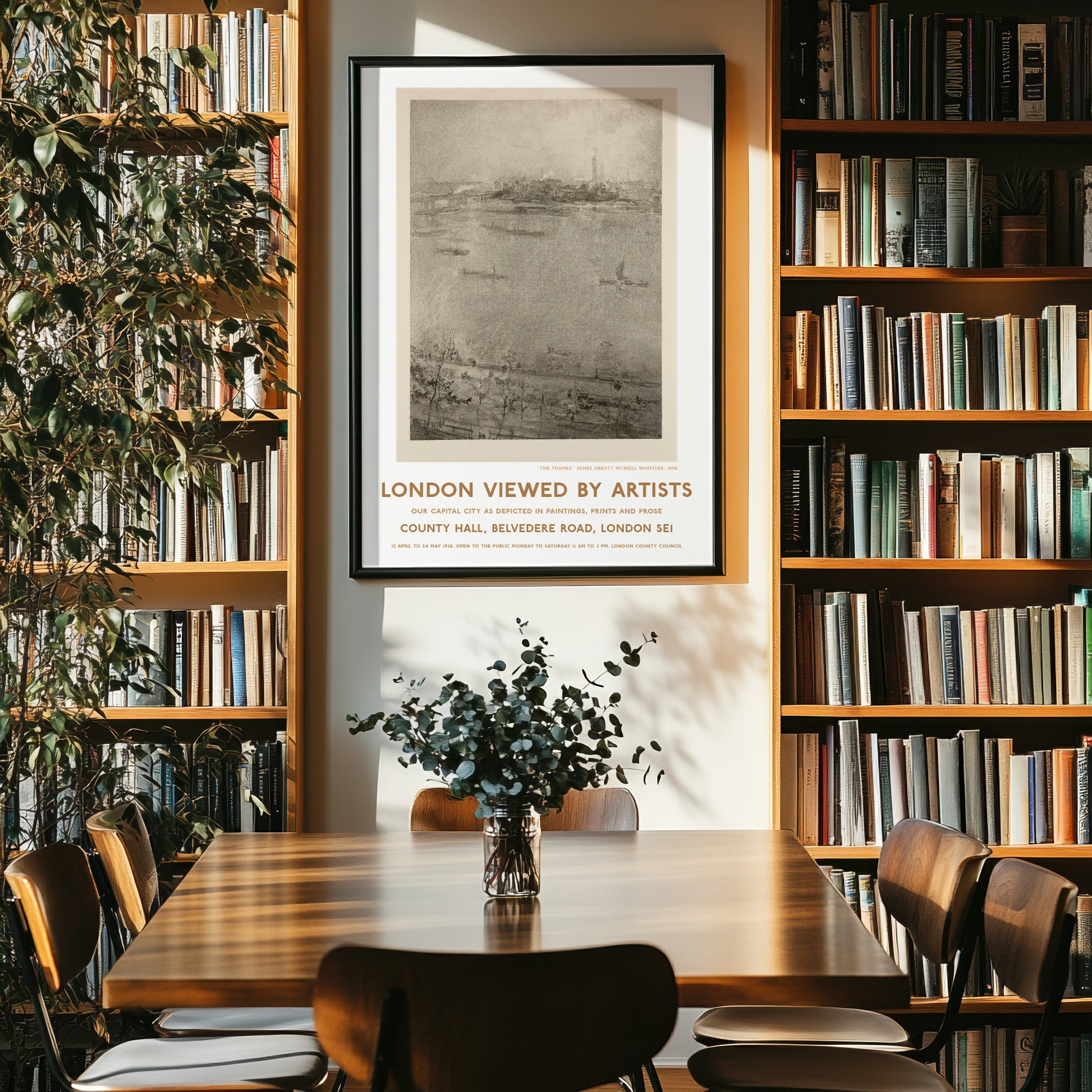 This poster advertising an exhibition of artists' depictions of London features one of James Abbott McNeill Whistler's prints of the River Thames.