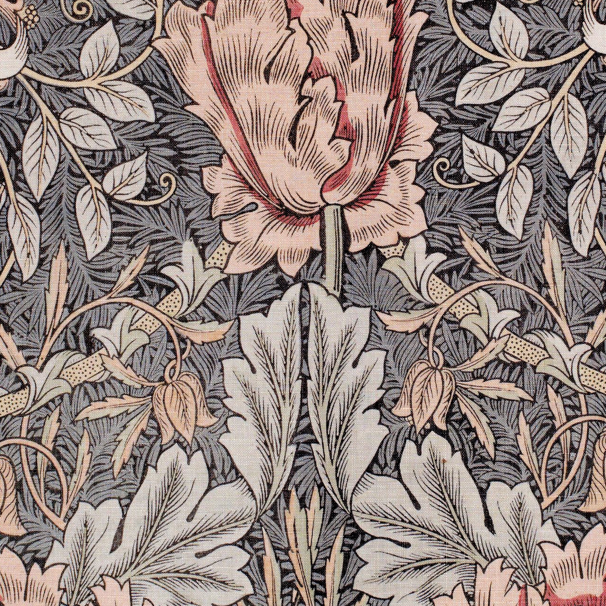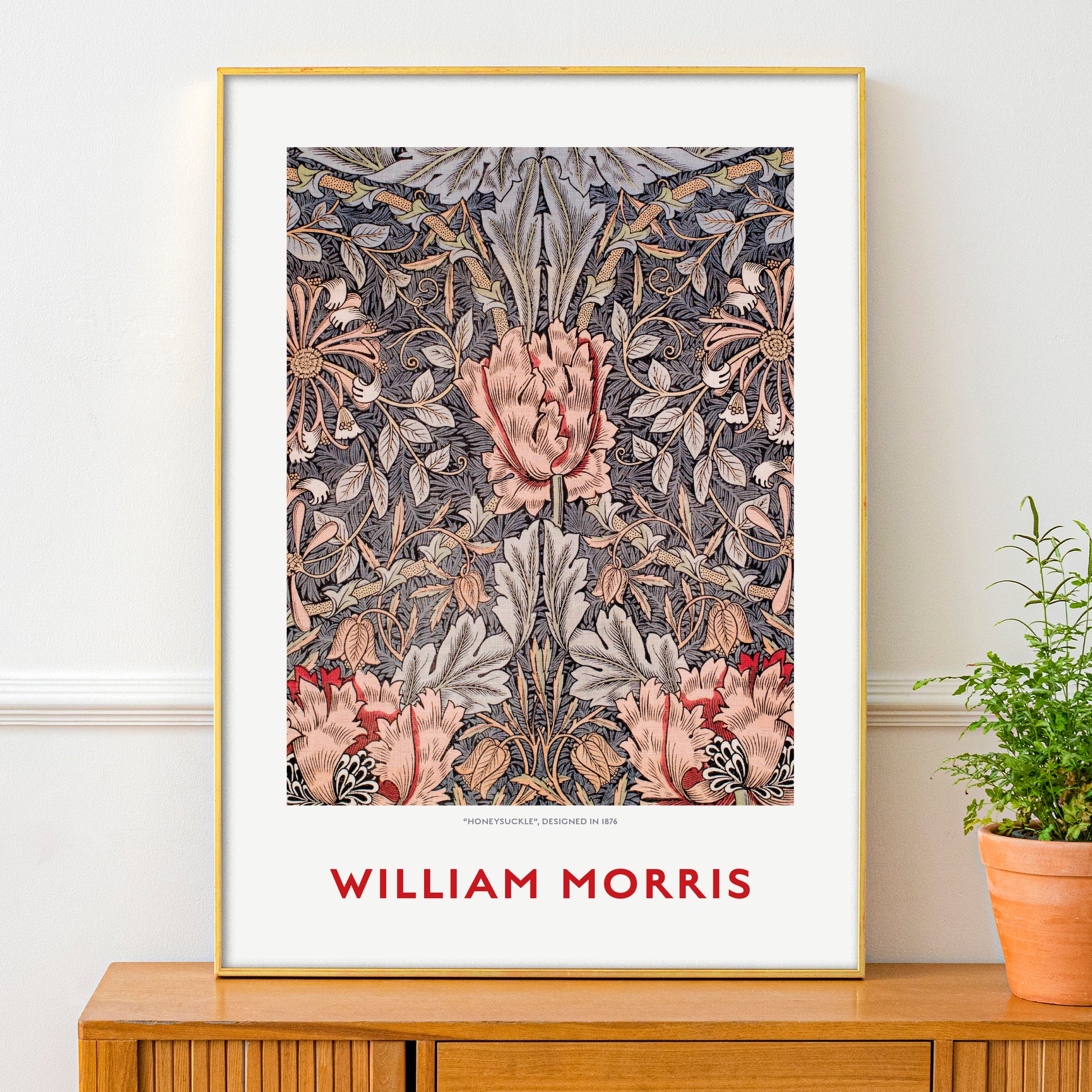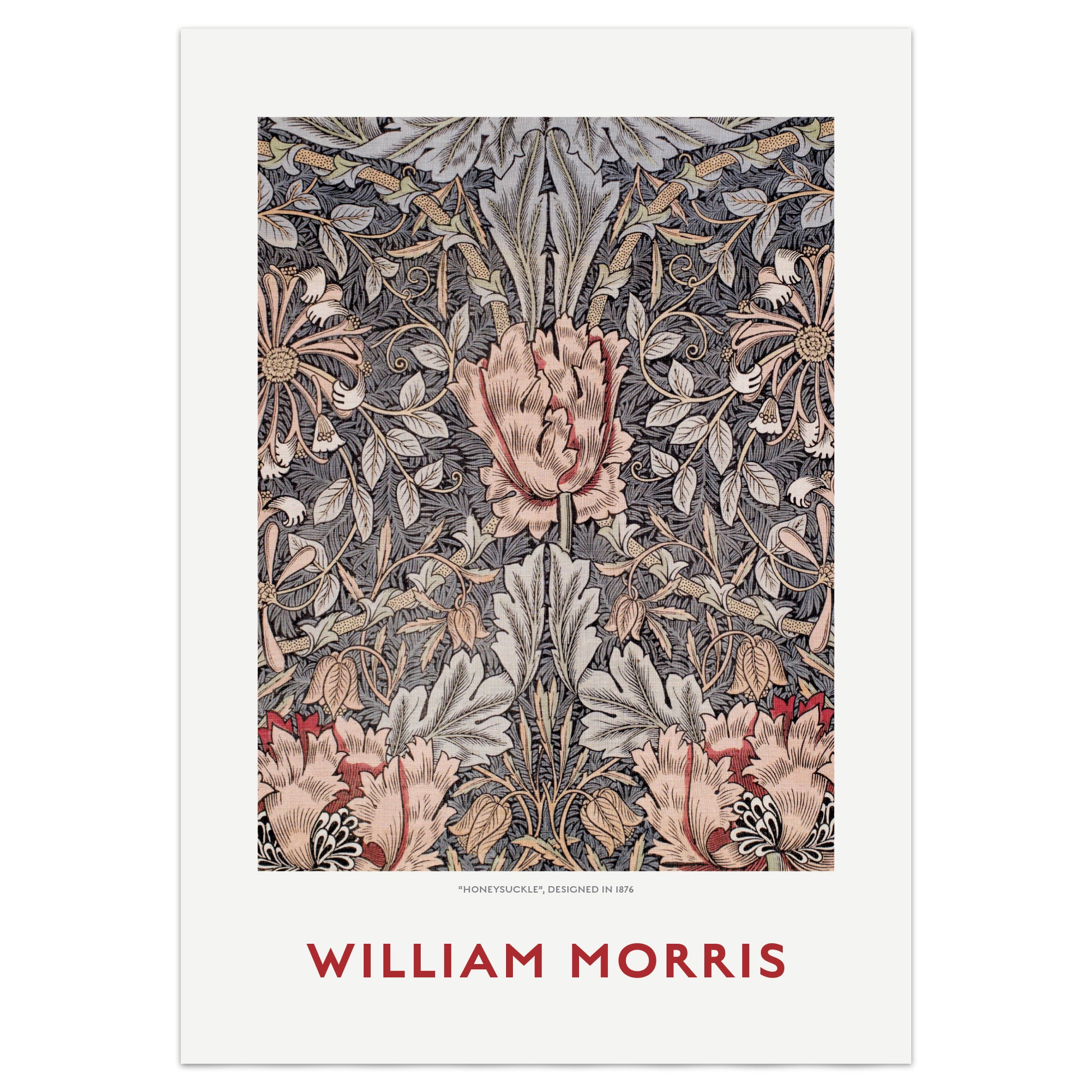This exhibition poster features the Arts and Crafts artist William Morris' 1876 tesxtile design entitled Honeysuckle.